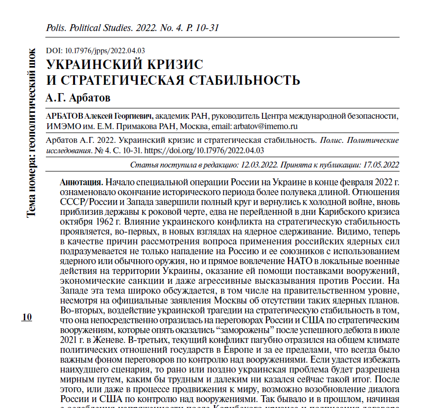Украинский кризис и стратегическая стабильность (А.Г. Арбатов)