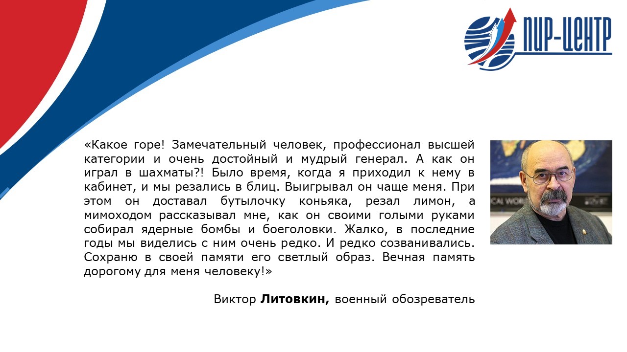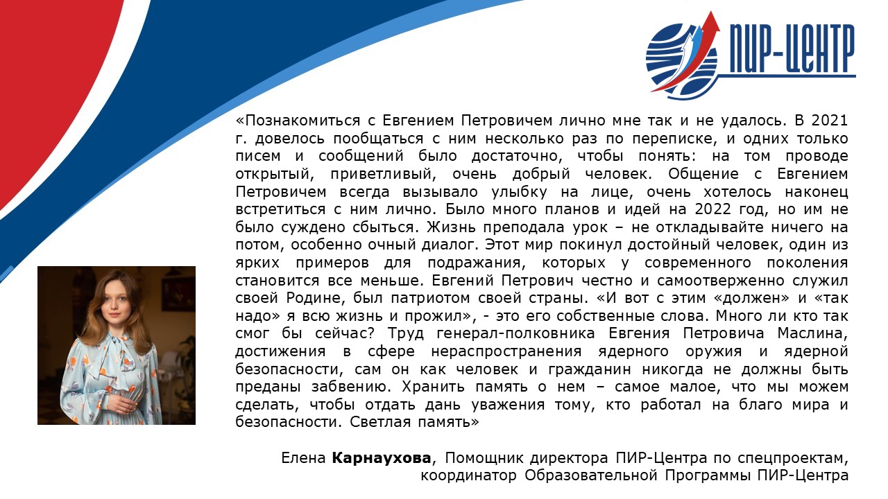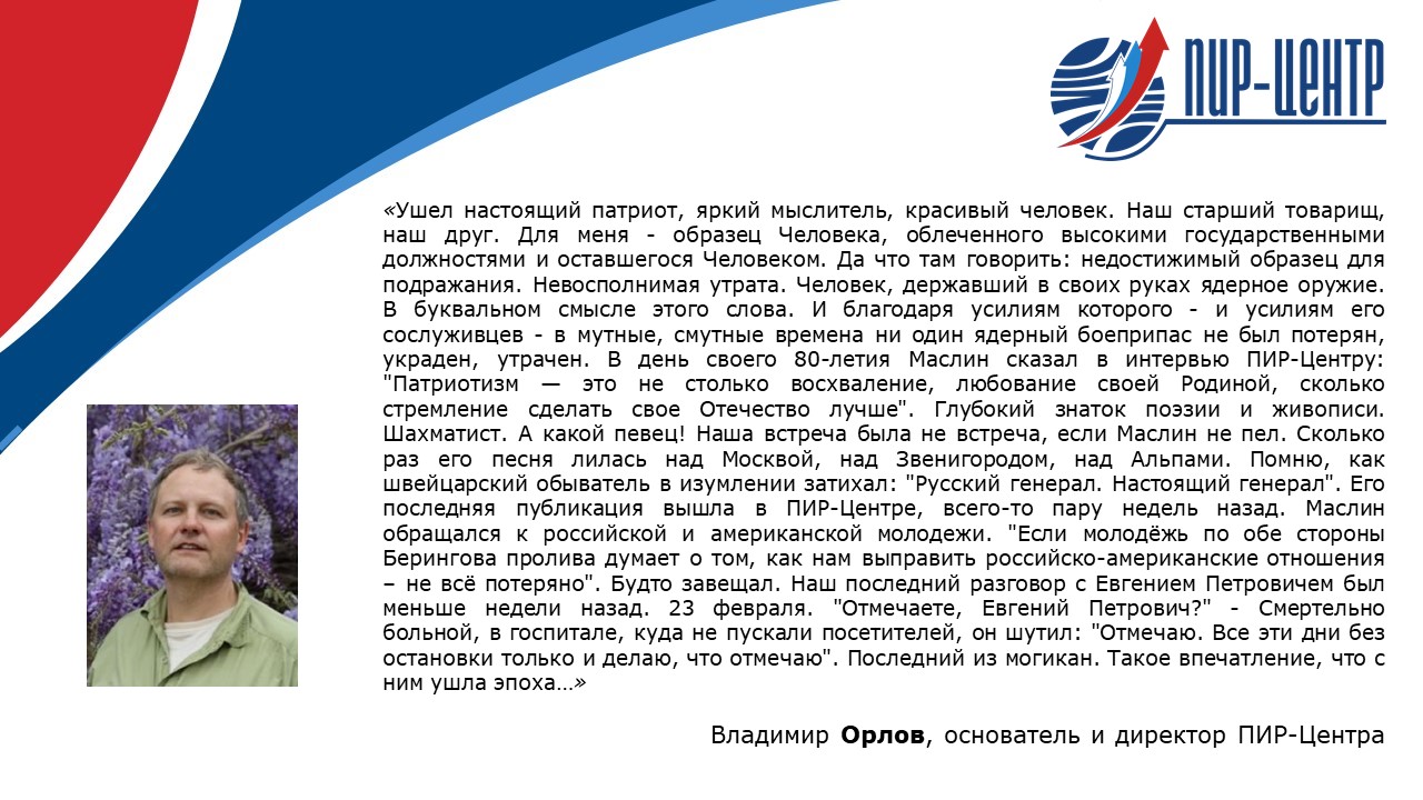 “Печальная новость из Москвы – 28 февраля скончался генерал Евгений Маслин. В 1992-1997 годах он был начальником 12-го главного управления, занимающегося ядерным оружием. Он наблюдал за безопасным выводом ядерного оружия из Казахстана, Белоруссии и Украины. Один из профессионалов старой школы, которого я уважал”.