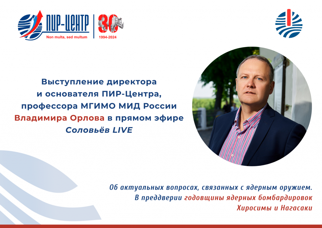 Директор и основатель ПИР-Центра, профессор МГИМО МИД России Владимир Орлов выступил в прямом эфире программы Соловьёв LIVE, где обсудил с Сергеем Карнауховым актуальные вопросы, связанные с ядерным оружием в преддверии годовщины ядерной бомбардировки Хиросимы и Нагасаки.