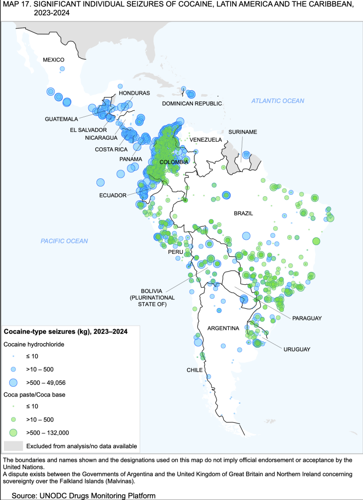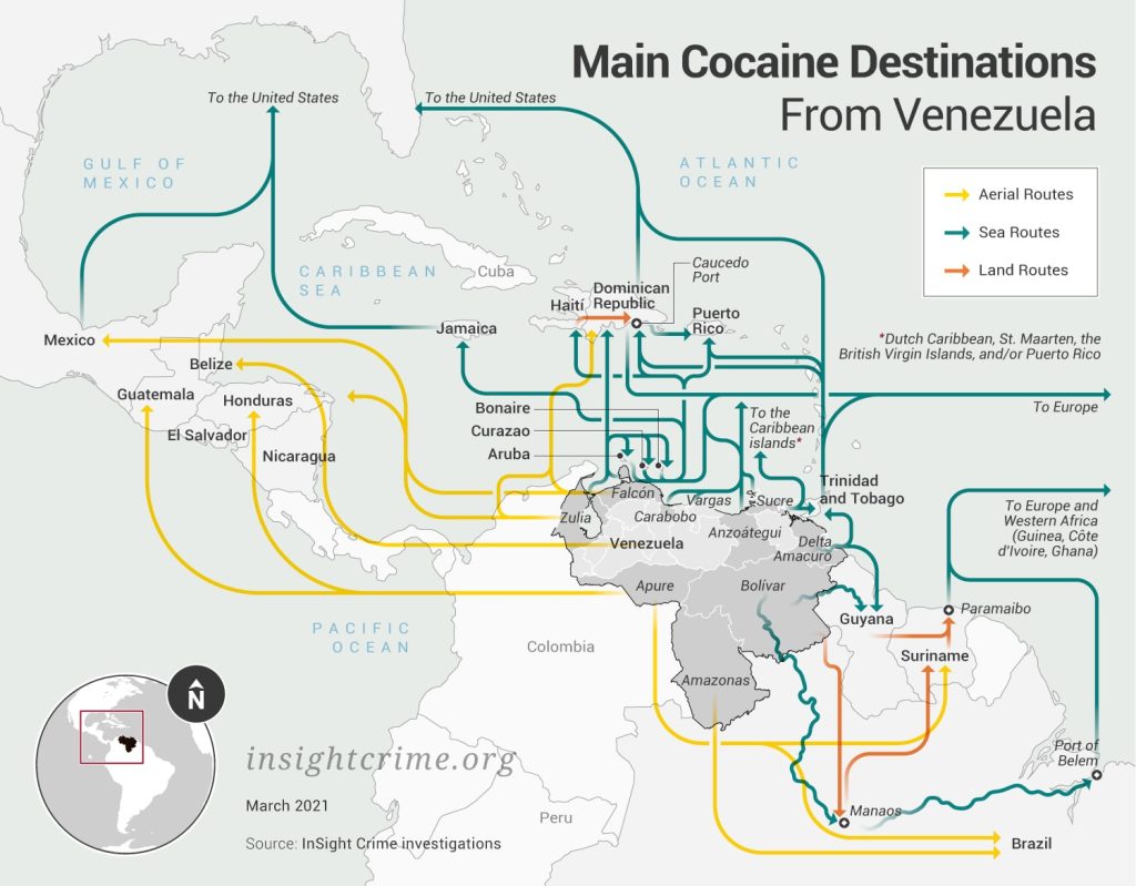 Данный тезис отчасти подтверждается статистикой. Несмотря на заявления Каракаса об успехах в борьбе с наркотиками, доклад УНП ООН за 2025 год указывает, что Венесуэла, в отличие от Колумбии, изымает в основном небольшие партии кокаина, оставаясь при этом ключевым узлом как для морской, так и авиационной транспортировки либо напрямую в США, либо через острова Карибского бассейна. Отсутствие транзитных посредников в Центральной Америке или Мексике повышает рентабельность данного маршрута, что создает мощный экономический стимул для продажи кокаина в стране с самым массовым употреблением наркотиков в мире.
