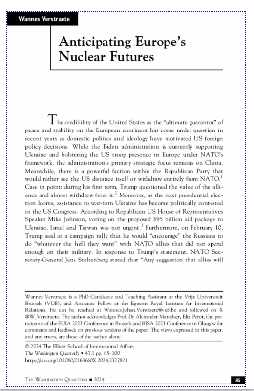 Весной 2024 года в журнале The Washington Quarterly была опубликована статья Ваннеса Верстраэта, бельгийского исследователя, ассистента кафедры политологии Брюссельского университета (VUB), под названием «Anticipating Europe’s Nuclear Futures». Это глубокое исследование, посвящённое ядерному будущему Европы в контексте растущей геополитической нестабильности и изменения баланса сил в мире.