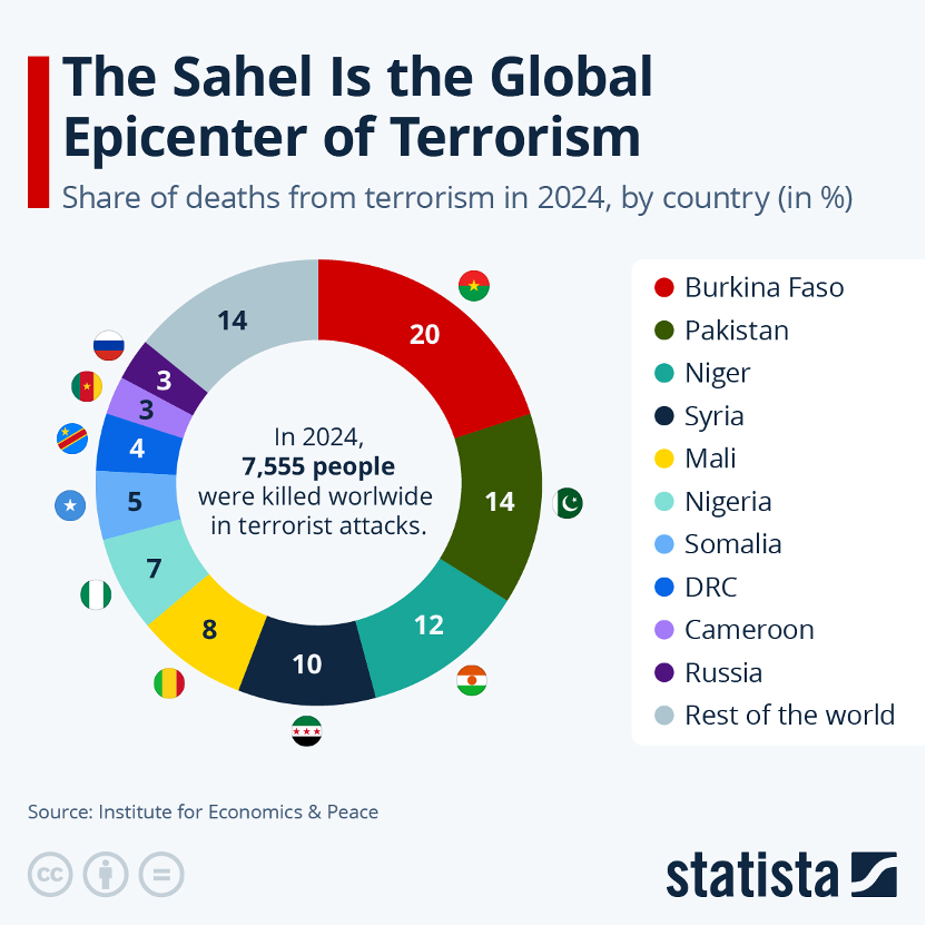 Политические перевороты в Мали (2021), Буркина-Фасо (2022) и Нигере (2023) стали поворотными моментами для региональной безопасности. Все три страны вышли из альянса G5 Сахель, переориентировавшись на суверенистский дискурс и отказ от прежней системы сотрудничества с ЕС и Францией[17]. Это привело к ослаблению западного военного присутствия и открыло пространство для альтернативных форм влияния – прежде всего со стороны России и Китая.