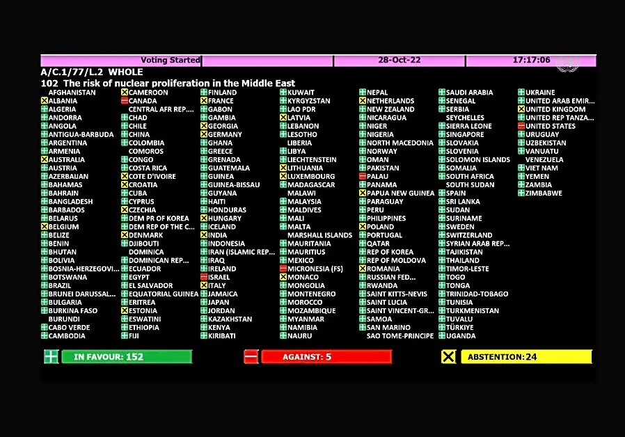 28 октября Первый комитет Генеральной Ассамблеи ООН принял резолюцию о «Риске распространения ядерного оружия на Ближнем Востоке». В центре ее внимания – Израиль и его ядерный арсенал. 152 государства выступили за присоединения Израиля к ДНЯО и передачи своих ядерных объектов в ведение МАГАТЭ. Пять государств – Канада, Израиль, Микронезия, Палау и США – проголосовали против принятой резолюции. Еще 24 страны, включая европейских членов «ядерной пятерки» Великобританию и Францию, воздержались. Проект резолюции был представлен Египтом, Иорданией, Бахрейном, ОАЭ и другими 17 государствами.