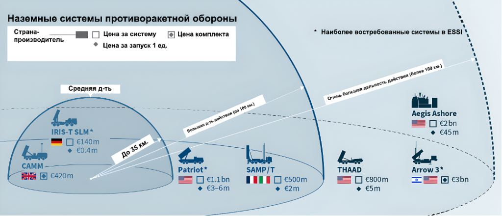В рамках ESSI предусмотрено создание эшелонированной системы ПВО/ПРО, охватывающей диапазоны от малой (до 15 км) до большой (свыше 100 км) дальности: