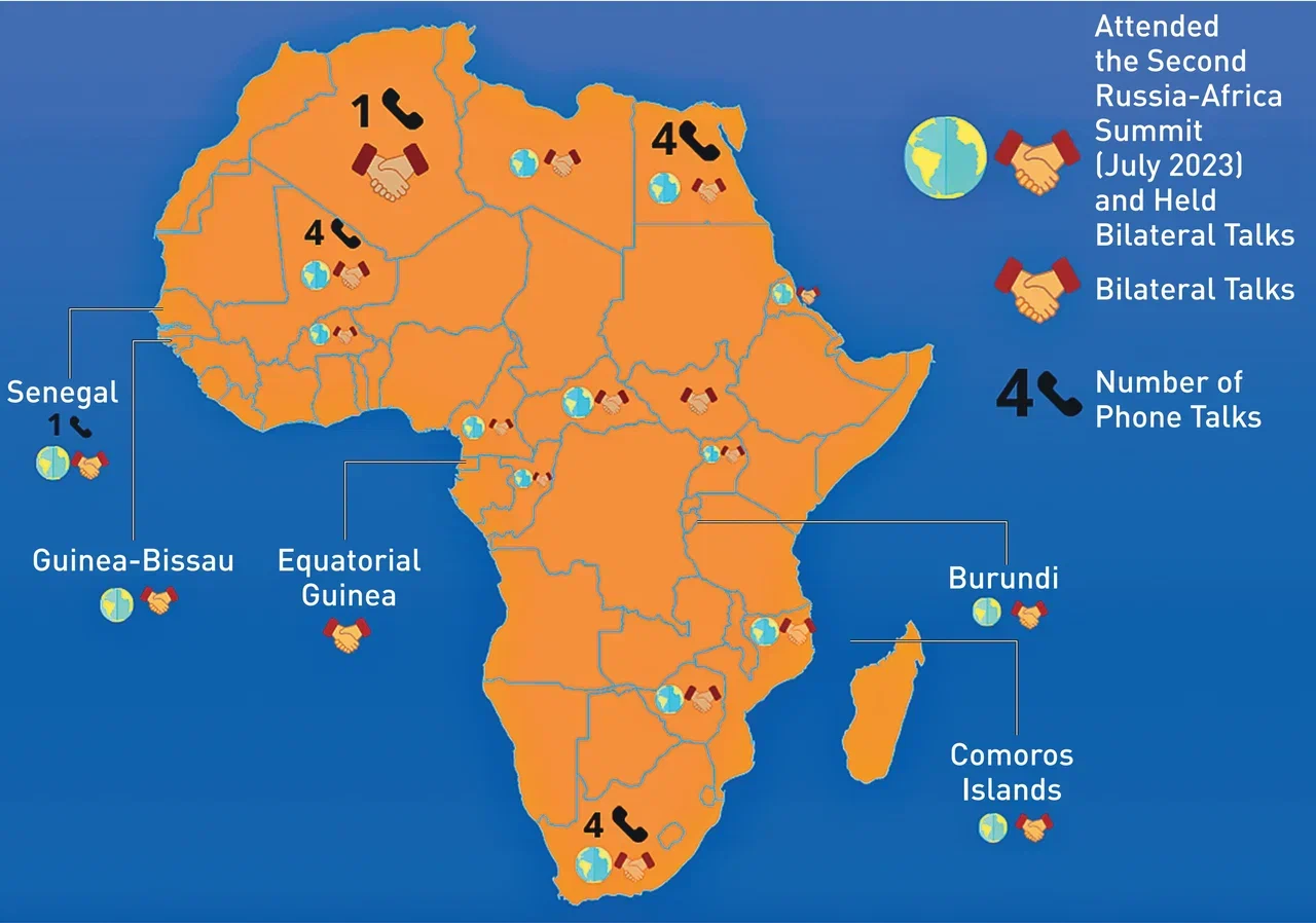 Source: Valdai Discussion Club (https://valdaiclub.com/multimedia/infographics/international-north-south-transport-corridor-/) Map 9. Vladimir Putin’s Contacts with African Heads of State and Governments in 2023 (2023).