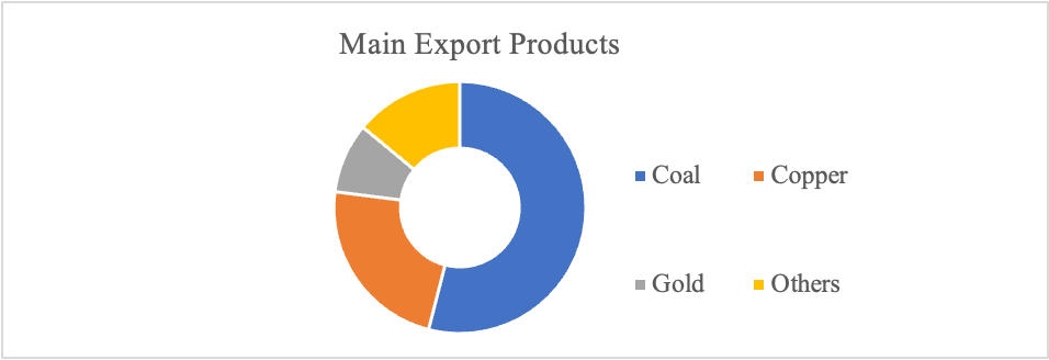 The main source of energy in Mongolia is coal. Mongolia ranks 10th in the world in terms of coal reserves, with total proven reserves estimated at 150 billion tons by the Ministry of Mineral Resources and Energy of Mongolia. Coal and copper are the main exports commodities of the country.