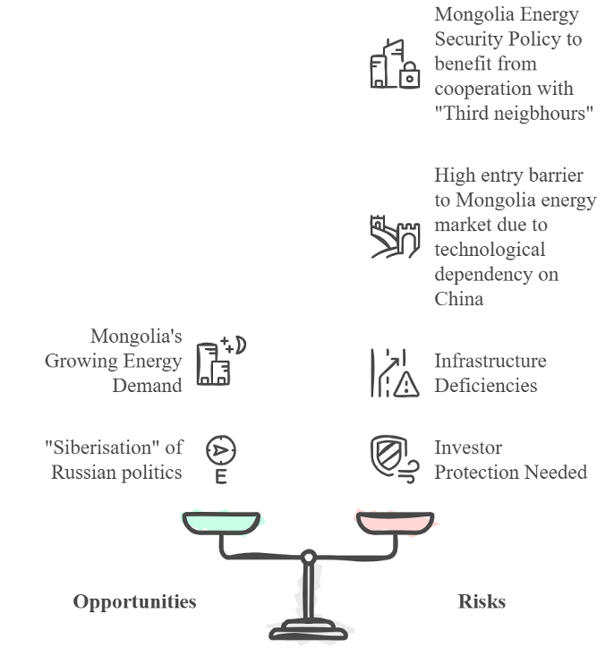 Mongolia with its huge energy resources can be considered as a perspective partner in mineral development and extraction as well as other commercial and scientific energy projects. For Russia, there are several opportunities and risks.