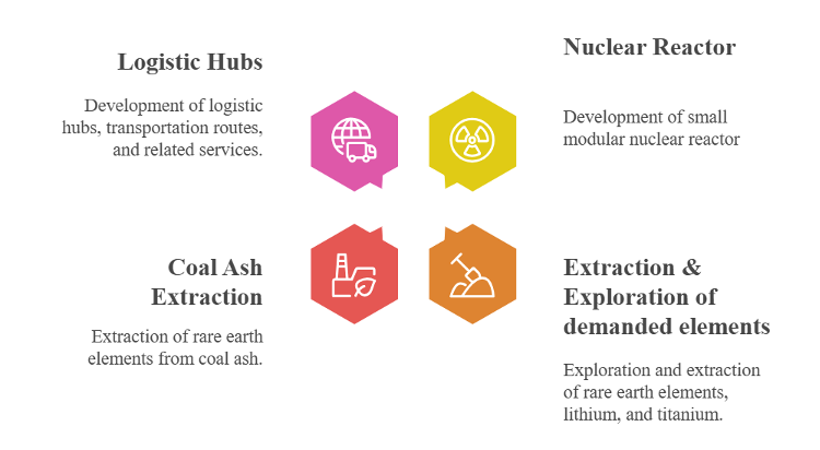 Secondly, exploration and extraction of REEs, Lithium and Titanium. The increasing industrial demand and the wide range of resource applications are making Mongolia an appealing investment destination for Russia, considering the close proximity of their shared borders. Russia has demonstrated significant interest in Mongolia’s lithium reserves, with ongoing geological mapping activities aimed at assessing the potential of these deposits. The current focus is on evaluating lithium concentration levels to determine the required development capacities, which involves two key objectives: firstly, to update and build upon previous research conducted by Russian scientists, including studies from the Soviet era, and secondly, to conduct a comprehensive analysis of the economic viability of lithium extraction projects. This dual-pronged approach reflects Russia’s strategic intent to thoroughly understand and potentially capitalize on Mongolia’s lithium resources. Pace of such activities should be quick due to ongoing geopolitical competition.