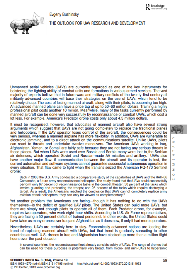 [1] Originally published: Evgeny Buzhinsky. The Outlook for UAV Research and Development // Security Index Journal, №3 (104). 2013, p. 59-65. URL: https://pircenter.org/wp-content/uploads/2022/11/Security-Index-%E2%84%963-104-2013.pdf