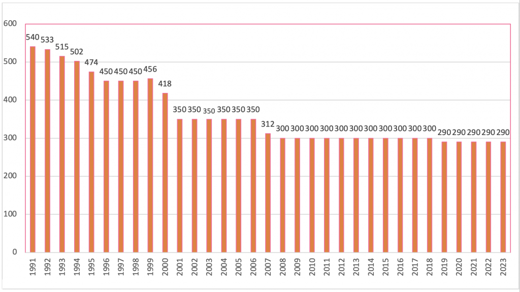 As of 2022, according to SIPRI estimates, France has 290 warheads, 280 of which are deployed[2]. France has been observing the ceiling of 300 nuclear warheads since 2008 when the corresponding decision was made by the French president Nicolas Sarkozy (2007-2012). In 2007, France had 348 warheads[3]. The peak falls on 1991-1992 – then France had 548 warheads[4].