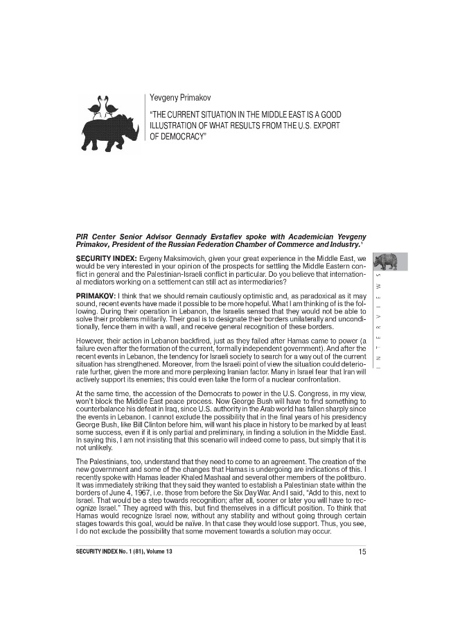 [1] This chapter is based on the conversation between PIR Center Senior Advisor Gennady Evstafiev and Acad. Evgeny Primakov, President of the Russian Federation Chamber of Commerce and Industry. Gennady Evstafiev’s interview with Acad. Evgeny Primakov took place on November 14, 2006. This interview was first published as: Евгений Примаков: «Сегодняшняя ситуация на Ближнем Востоке – очень хорошая иллюстрация того, к чему приводит американский экспорт демократии» // Индекс безопасности, 2007. № 1 (81). Том 13.