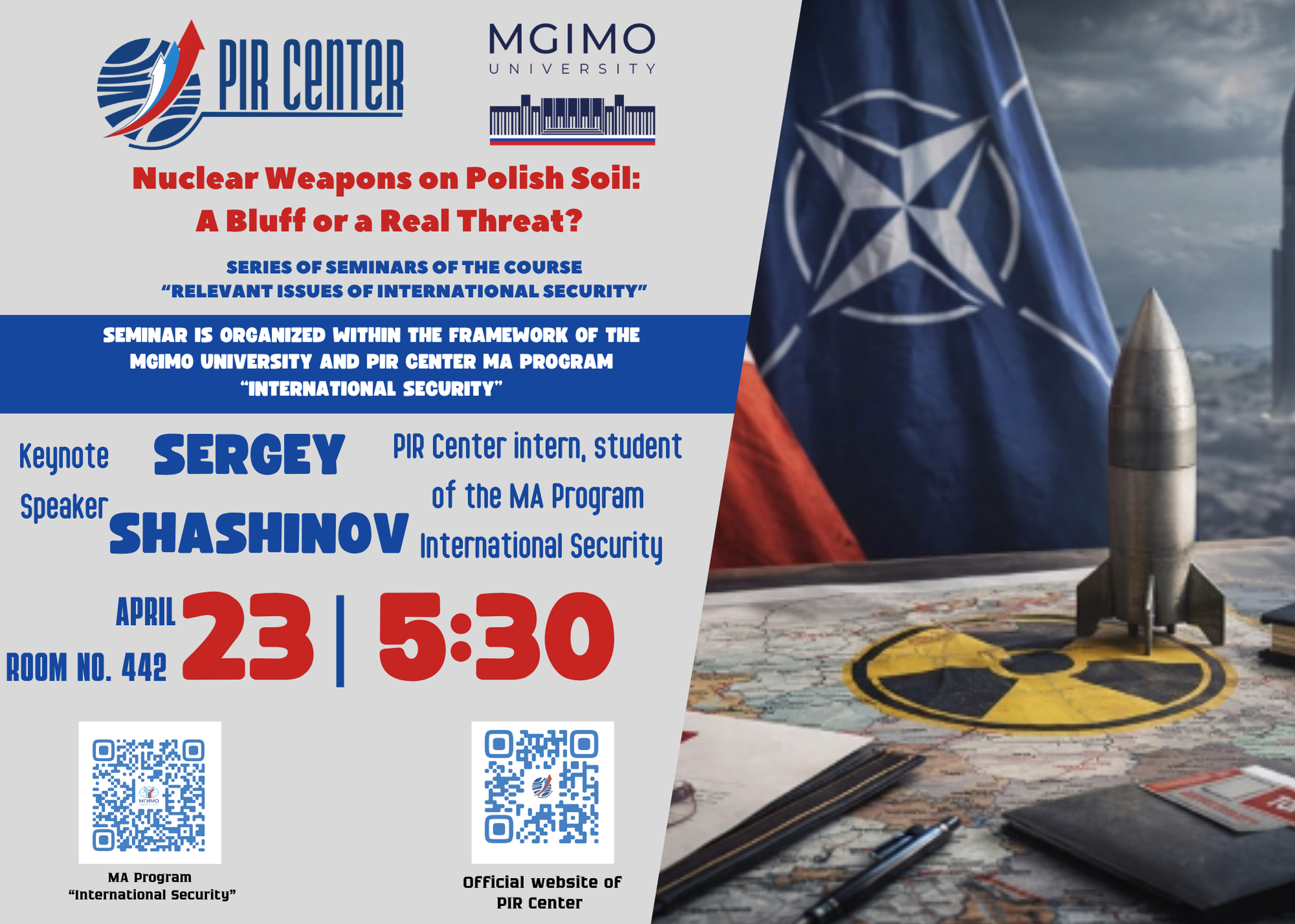 During the event, the speaker will examine the history of the “Polish nuclear dossier” and analyze both the circumstances that led to the radicalization of Poland’s approach and four potential scenarios for the deployment of nuclear weapons on Polish territory. As part of the defense of his research thesis, the PIR Center intern will also highlight the key directions of the modernization of the nuclear component of Polish foreign policy, its economic and technical features, as well as the geopolitical implications for NATO’s eastern flank and Russia.