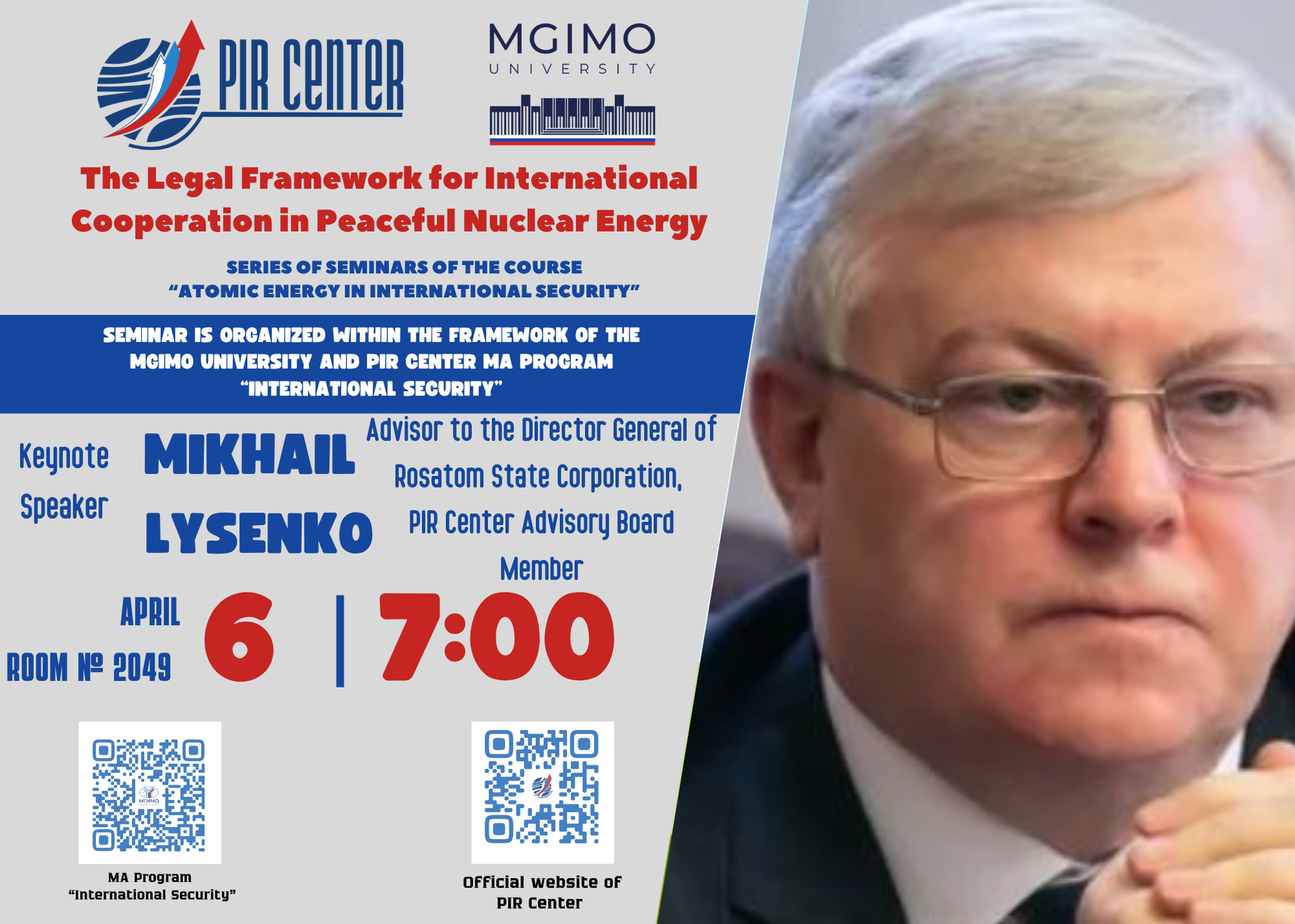 👤 The event will feature a lecture by Dr. Mikhail Lysenko, PhD in Law, Advisor to the Director General of Rosatom State Corporation and PIR Center Advisory Board Member. The lecture will examine Russia’s practice of concluding bilateral intergovernmental agreements on the peaceful use of nuclear energy and will provide a classification of the agreements concluded. In addition, the seminar will present data on the number of such agreements and Russia’s specific partners, and will offer recommendations on improving the practice of drafting intergovernmental agreements.