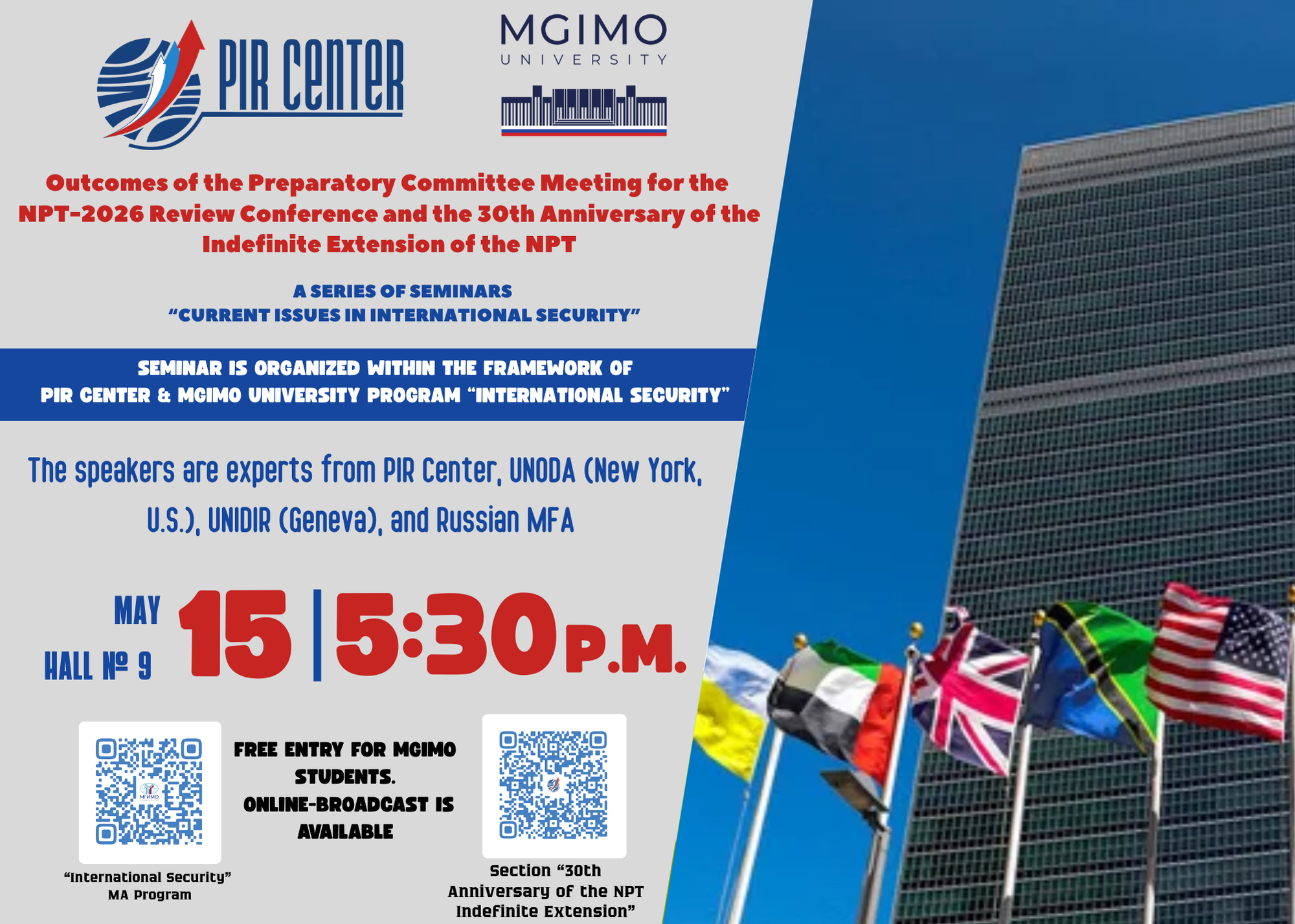 🔥 On May 15, 2025, PIR Center jointly with MGIMO University will hold an expert seminar on the outcomes of the Preparatory Committee (PrepCom) meeting for the NPT-2026 Review Conference and the 30th anniversary of the NPT indefinite extension. During the event, experts participating in the third session of the PrepCom (taking place from April 28 to May 9, 2025) and representing various institutions: the United Nations, the Russian Ministry of Foreign Affairs, and PIR Center will share their assessments. In particular, speakers at the expert seminar will be: Dr. Vladimir Orlov, Founding Director, PIR Center; MGIMO University Professor, Academic Director of MA Program International Security; Mr. Andrey Baklitskiy, Senior Researcher WMD Program, United Nations Institute for Disarmament Research (UNIDIR), Geneva (Switzerland); Ms. Alexandra Zubenko, Consultant, PIR Center; Intern, United Nations Office for Disarmament Affairs, (UNODA), New York (U.S.); and others.
