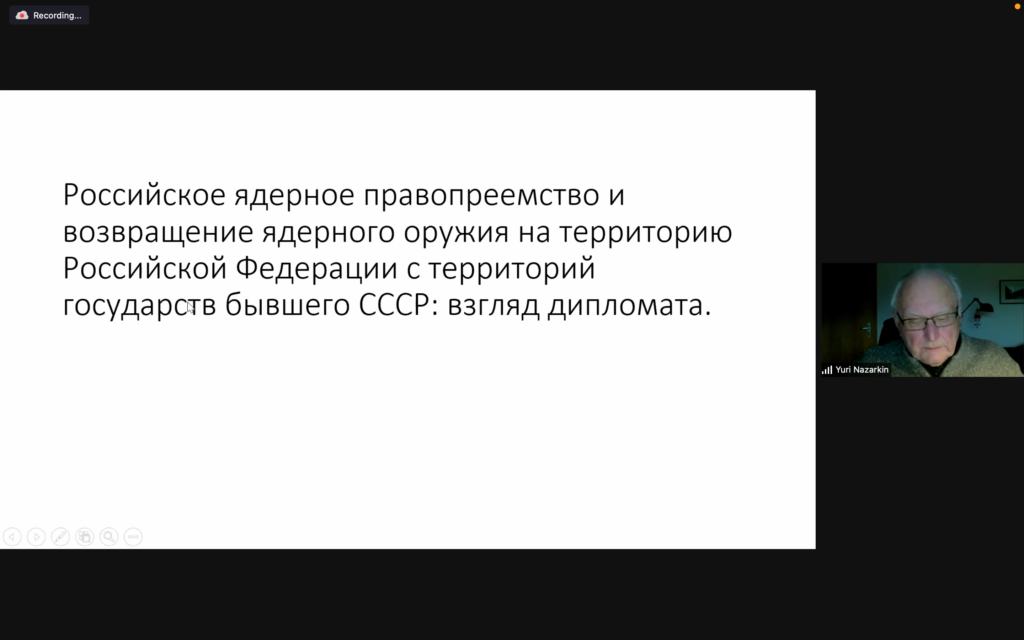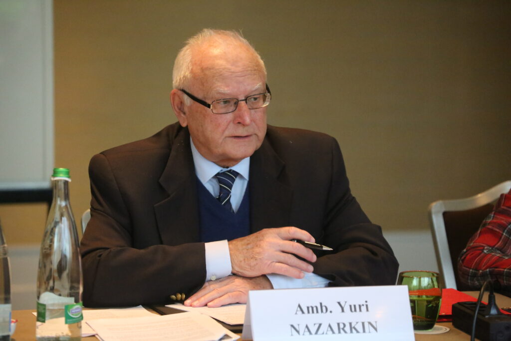 In 1956–1992, Yuri K. Nazarkin worked in the system of the Ministry of Foreign Affairs of the USSR/Russia, for about two decades of which — on issues of disarmament and nuclear nonproliferation. He contributed to drafting the Treaty on the Non-Proliferation of Nuclear Weapons (NPT), the Biological Weapons Convention (BWC), the Treaty on the Prohibition of the Emplacement of Nuclear Weapons and Other Weapons of Mass Destruction on the Sea-Bed and the Ocean Floor and in the Subsoil thereof (the Seabed Treaty), etc. In 1987–1989, Yuri K. Nazarkin was the Representative of the USSR to the Conference on Disarmament in Geneva, Switzerland. He negotiated the draft of the Chemical Weapons Convention (CWC). Yuri K. Nazarkin was the Head of the delegation of the USSR during the US-Soviet negotiations resulted in the conclusion of the 1991 Strategic Arms Reduction Treaty (START-1 Treaty). In 1992–1995, he held the position of the Deputy Secretary of the Security Council of the Russian Federation. After retiring in 1996, Yuri K. Nazarkin has been engaged in teaching. He was Professor at the Geneva Centre for Security Policy (GCSP), Switzerland. In 2006–2021, he was Honorary Member of the Centre Russe d’Etudes Politiques, France. He is Professor and Honorary Doctor of International Relations (honoris causa) at the Geneva School of Diplomacy and International Relations (GSD), Switzerland.