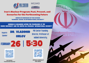 MOSCOW. FEBRUARY 19, 2026. PIR PRESS. On February 26, 2026, the next seminar will be held on the topic “Iran’s Nuclear Program: Past, Present, and Scenarios for the Near Future” within the framework of the PIR Center’s expert seminars series. The keynote speech will be delivered by Dr. Vladimir Orlov, PIR Center Founding Director and Professor at MGIMO University. The seminar will be held behind closed doors (by invitation only, off the record).