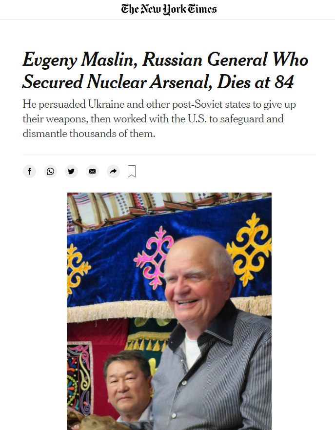 “General Maslin was different. An engineer who had taken over as head of Russia’s nuclear arsenal just months after the Soviet Union collapsed, he was among the few who embraced the American offer — and he then lobbied his colleagues to go along.