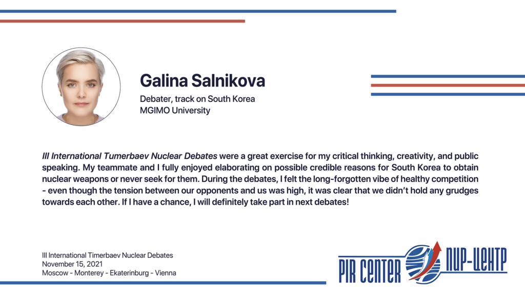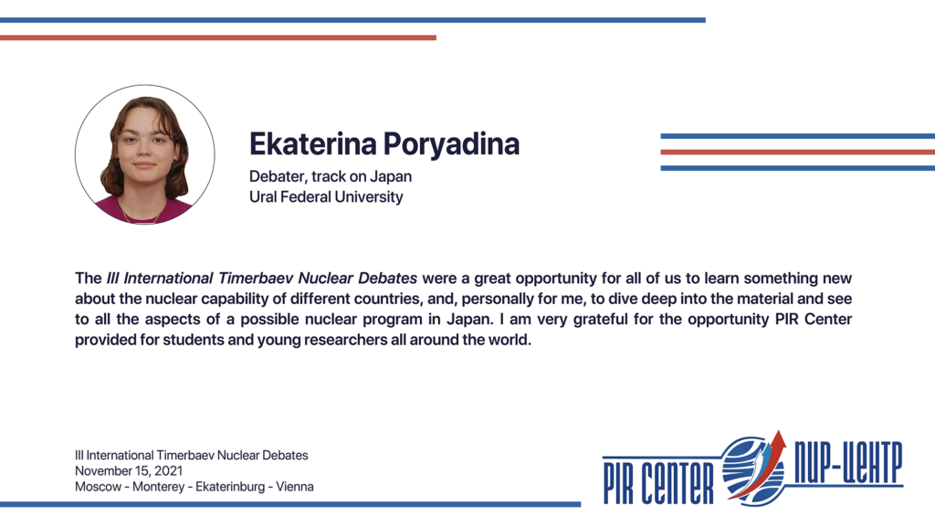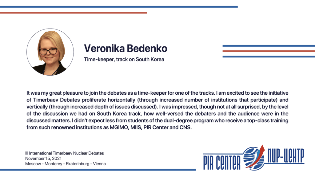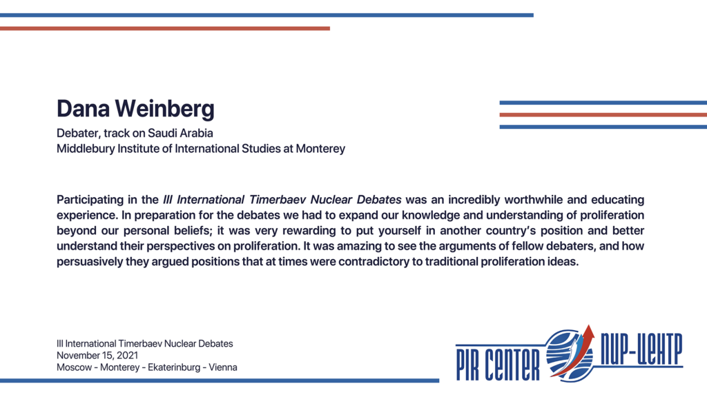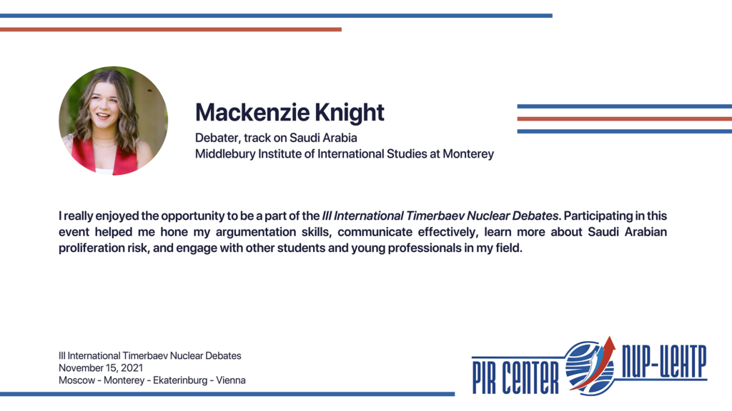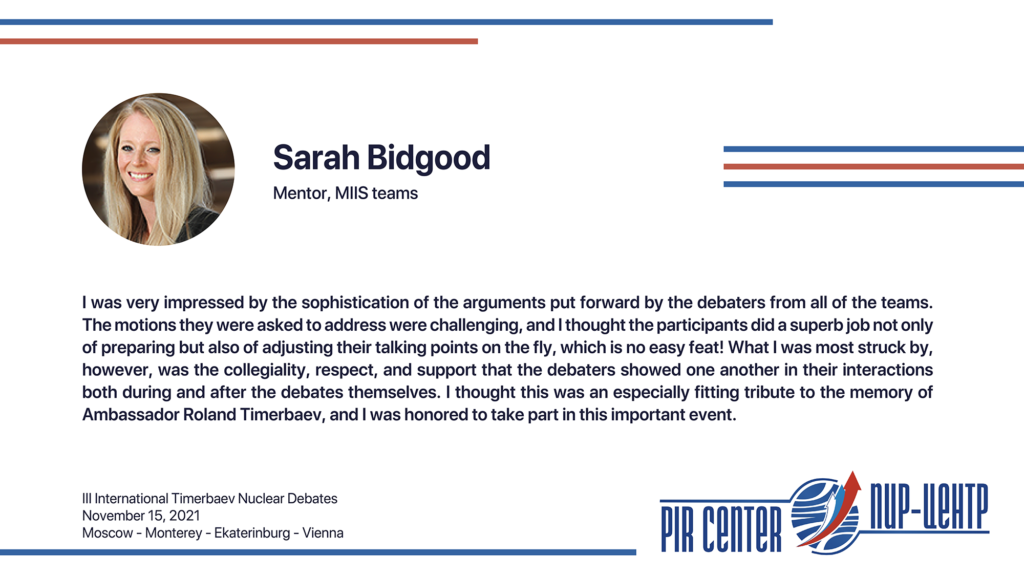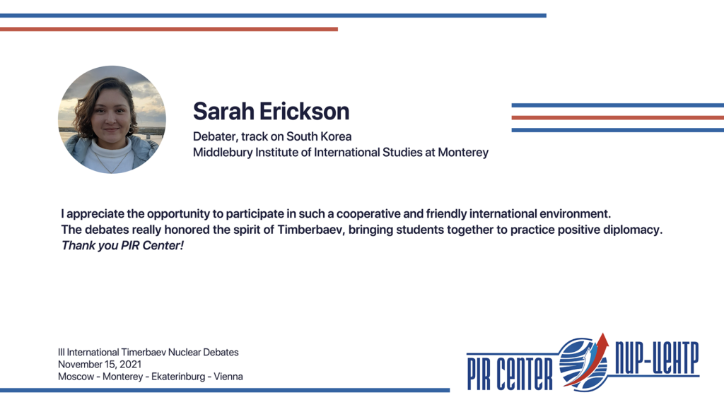 MOSCOW, NOVEMBER 25, 2021. PIR PRESS. «I appreciate the opportunity to participate in such a cooperative and friendly international environment. The Debates really honored the spirit of Timerbaev, bringing students together to practice positive diplomacy. Thank you, PIR Center!», — Sarah Erickson, participant of the III International Timerbaev Nuclear Debates, debater of the team of the Middlebury Institute of International Studies at Monterey, USA (MIIS), 2nd year student of the Dual Degree M.A. Program Global Security, Nuclear Policy and WMD Nonproliferation developed jointly by MGIMO, MIIS and PIR Center.