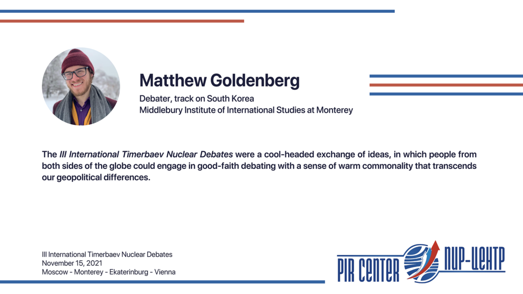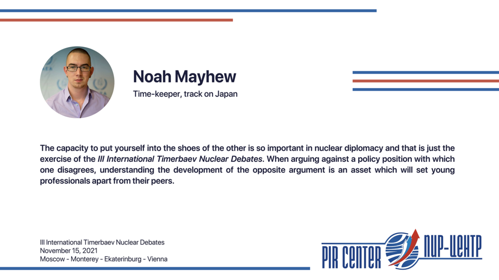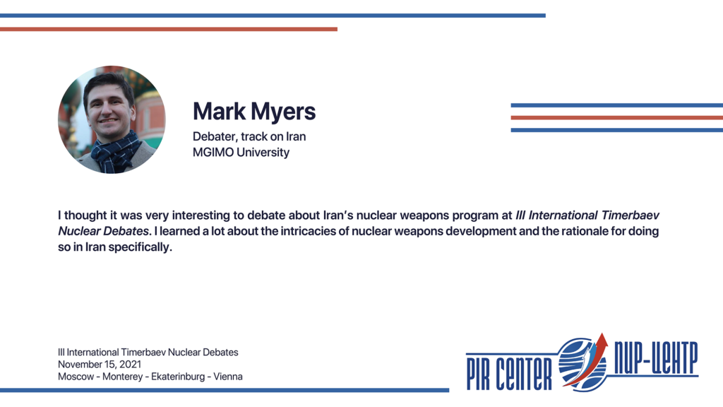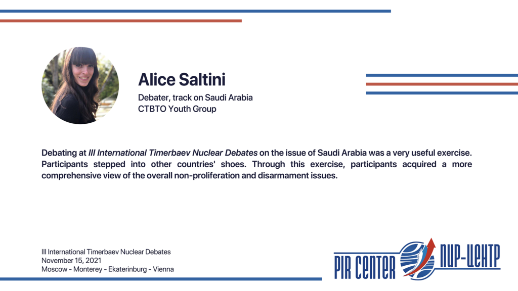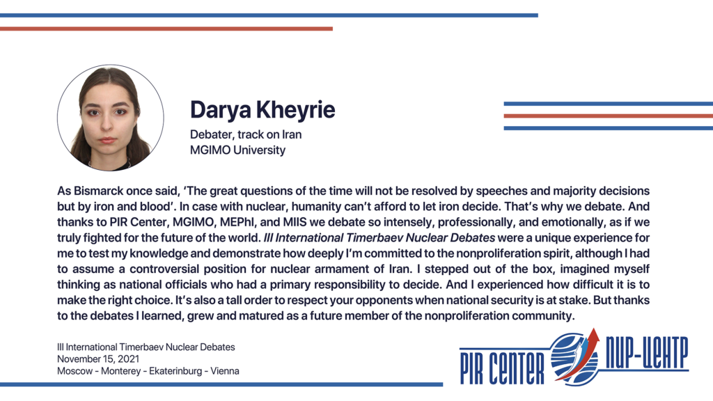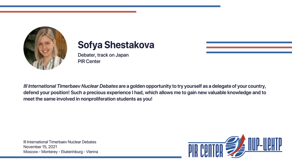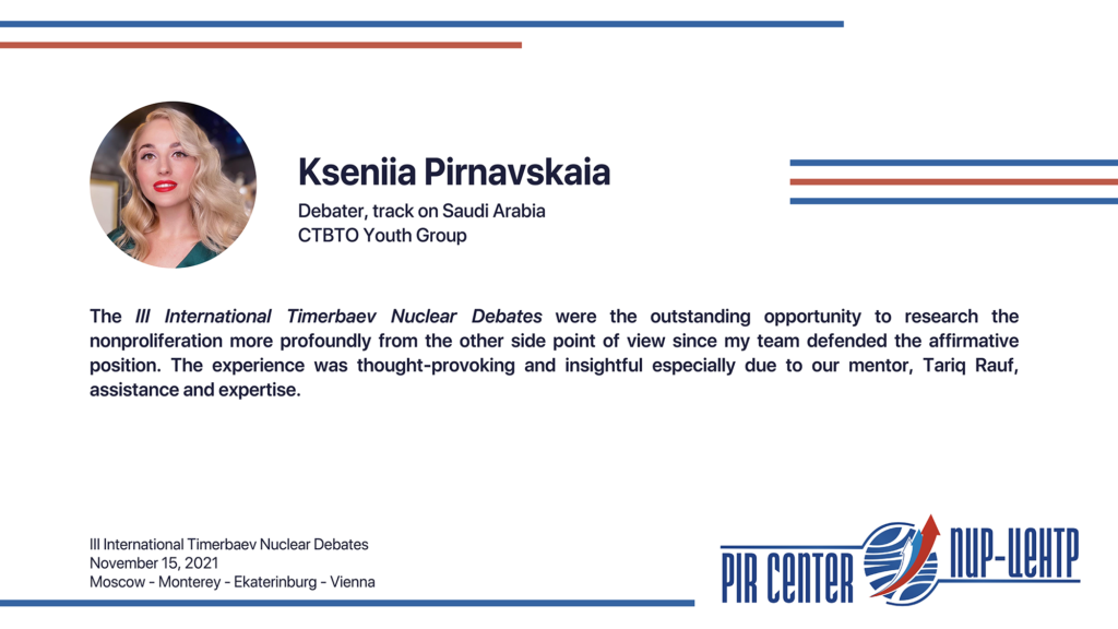 MOSCOW, NOVEMBER 25, 2021. PIR PRESS. «I appreciate the opportunity to participate in such a cooperative and friendly international environment. The Debates really honored the spirit of Timerbaev, bringing students together to practice positive diplomacy. Thank you, PIR Center!», — Sarah Erickson, participant of the III International Timerbaev Nuclear Debates, debater of the team of the Middlebury Institute of International Studies at Monterey, USA (MIIS), 2nd year student of the Dual Degree M.A. Program Global Security, Nuclear Policy and WMD Nonproliferation developed jointly by MGIMO, MIIS and PIR Center.
