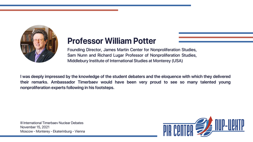 The debaters demonstrated a high level of training and erudition. «I was deeply impressed by the knowledge of the student debaters and the eloquence with which they delivered their remarks. Ambassador Timerbaev would have been very proud to see so many talented young nonproliferation experts following in his footsteps», — noted Dr. William Potter, Director, James Martin Center for Nonproliferation Studies, and Sam Nunn and Richard Lugar Professor of Nonproliferation Studies Middlebury Institute of International Studies at Monterey (USA), a member of the PIR Center Advisory Board, a Foreign Member of the Russian Academy of Sciences (RAS).