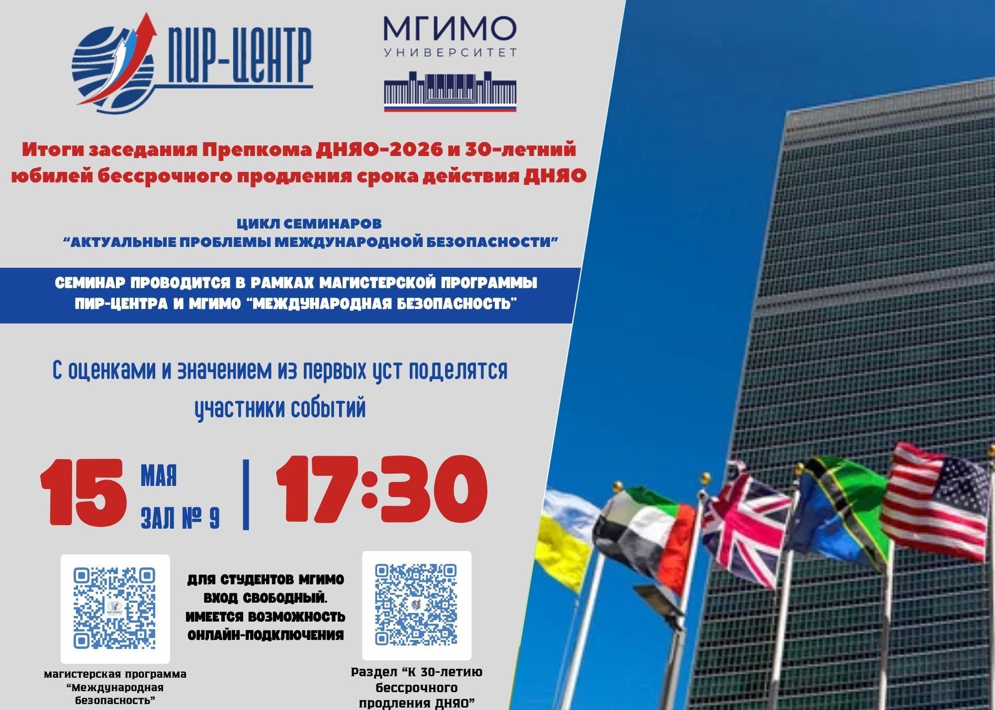 ⚡️ Мероприятие состоится в стенах МГИМО МИД России и пройдет 15 мая с 17:30 до 19:00 (МСК) в зале № 9. Для участников, не имеющих возможности присутствовать лично, будет обеспечена возможность онлайн-подключения (при предварительной регистрации). В ходе семинара будут обсуждаться ключевые результаты работы Подготовительного комитета, а также значение бессрочного продления ДНЯО для международной безопасности и его роль в предотвращении распространения ядерного оружия.