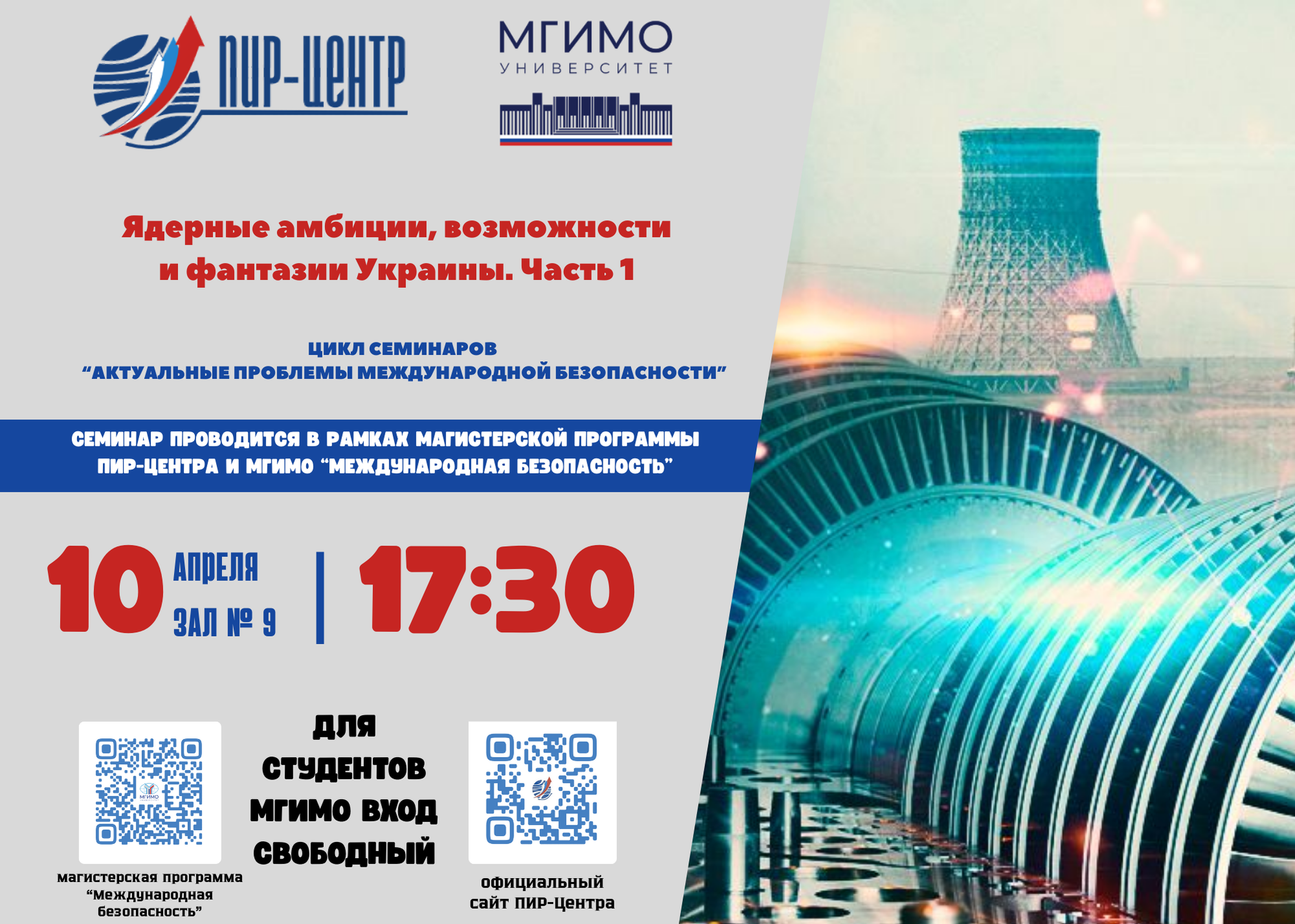⚡️ 10 апреля в 17:30 в рамках курса «Актуальные проблемы международной безопасности» магистерской программы ПИР-Центра и МГИМО МИД России «Международная безопасность» состоится семинар «Ядерные амбиции, возможности и фантазии Украины».