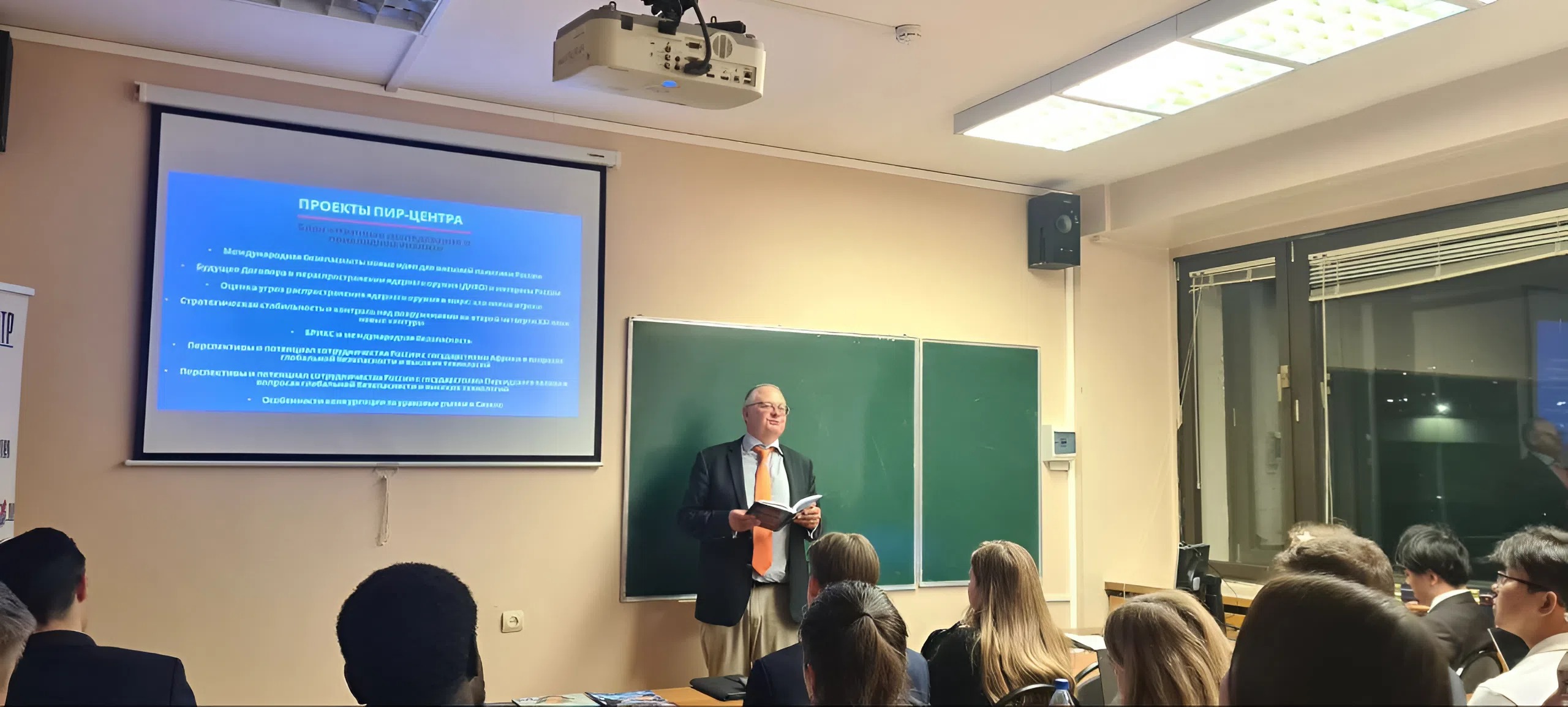 На второй приветственной встрече 25 сентября 2025 г. Владимир Орлов рассказал магистрантам о деятельности ПИР-Центра, обратив внимание слушателей на реализацию становых проектов организации по блокам «Научные исследования и прикладной анализ», «Образование, просвещение и повышение квалификации», «Информация и цифровые коммуникации» и «Сообщество «Под знаком ПИР»». Также Владимир Андреевич упомянул о флагманских образовательных проектах ПИР-Центра, включая Международную школу по проблемам глобальной безопасности.