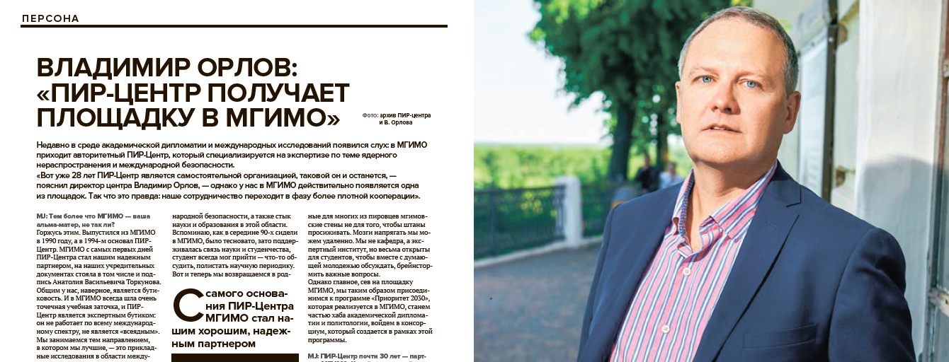 В свежем номере журнала MGIMOJournal (MJ), посвященном «героям» программы «Приоритет 2030», вышло интервью с директором и основателем ПИР-Центра, Владимиром Орловым. Программа стратегического академического лидерства «Приоритет 2030» реализуется Минобрнауки «в целях формирования широкой группы университетов, которые станут лидерами в создании нового научного знания, технологий и разработок для внедрения в российскую экономику и социальную сферу». Ранее ПИР-Центр и МГИМО заключили соглашение о реализации совместного образовательного проекта «Глобальная безопасность, стратегическая стабильность и контроль над вооружениями» в рамках программы «Приоритет 2030».