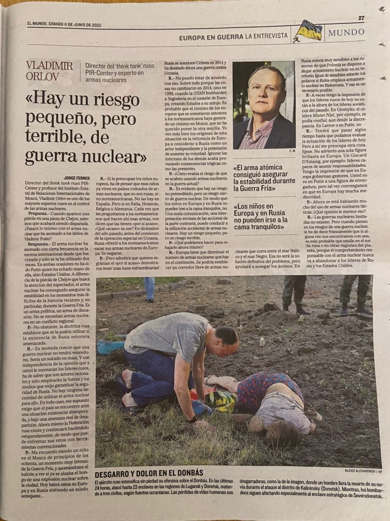 В интервью директора ПИР-Центра Владимира Орлова с журналистом испанской газеты El Mundo Хорхе Феррера затрагиваются вопросы рисков использования ядерного оружия на фоне украинского конфликта. Поговорили также о том, чем отличается чеховское ружьё от ядерного оружия, воспользуется ли Россия тактическим ядерным оружием на Украине, могут ли европейские дети нынче спать спокойно, американское или российское ядерное оружие представляет большую опасность глобальной безопасности, есть ли повод для оптимизма сегодня и какая раса придёт на смену нынешней немудрой человеческой расе.