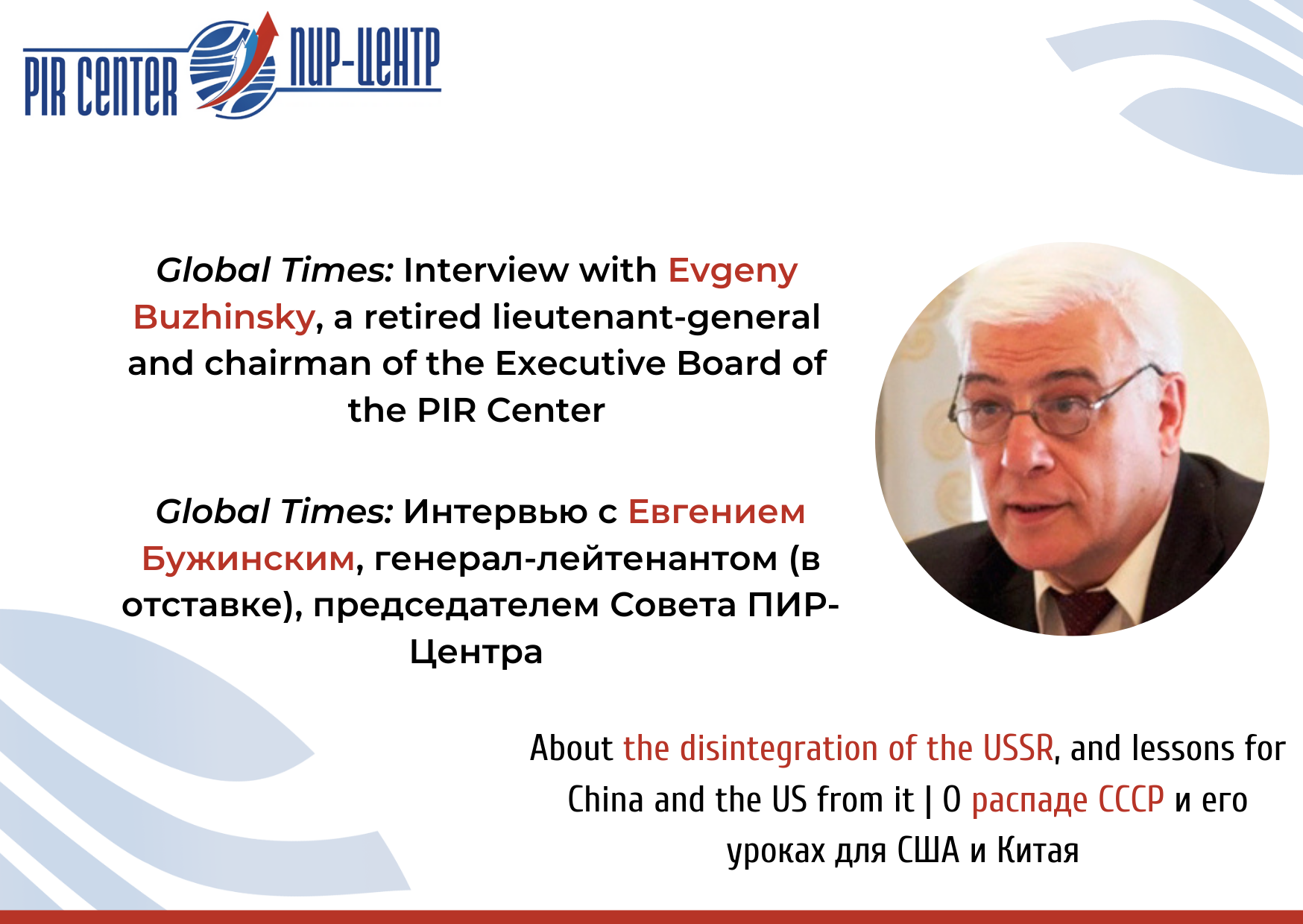 Прошло три десятилетия с момента распада СССР. Каково коллективное чувство в сегодняшнем российском обществе по этому поводу? Какие уроки может извлечь Китай из распада СССР? Евгений Петрович Бужинский, российский генерал-лейтенант в отставке и председатель Совета ПИР-Центра, поделился своими соображениями по этим вопросам с корреспондентом Global Times Лу Юаньчжи.