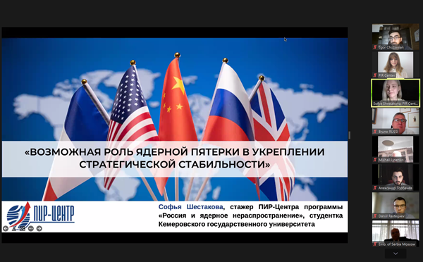 21 апреля 2022 г. ПИР-Центр провел Научную среду – неформальный экспертный семинар – на тему «Возможная роль ядерной пятерки в укреплении стратегической стабильности». В ходе мероприятия с установочным докладом, подготовленным по итогам исследовательской стажировки в ПИР-Центре, выступила Софья Сергеевна Шестакова, стажер программы «Россия и ядерное нераспространение» ПИР-Центра, студентка 4 курса Института истории и международных отношений Кемеровского государственного университета.