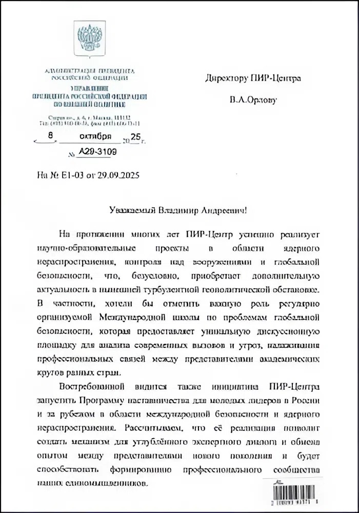 На своем очередном ежегодном заседании в октябре с.г. Совет АНО «ПИР-Центр» принял решение поддержать предложение основателя и директора ПИР-Центра В.А. Орлова о старте в 2026 году новой образовательной Программы наставничества молодых лидеров в России и за рубежом. Она включает проведение XXIV Международной школы по проблемам глобальной безопасности для молодых международников в июле 2026 г. Более подробную информацию и видеоролик, посвященный Программе наставничества молодых лидеров и Международной школе по проблемам глобальной безопасности, вы можете найти в специальном разделе на сайте ПИР-Центра.