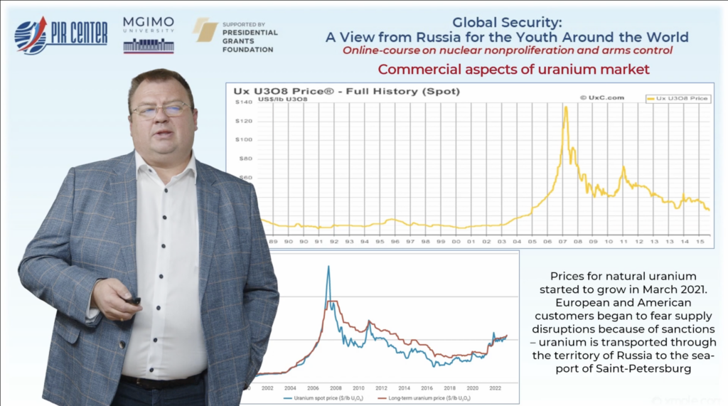 Четвертый раздел онлайн-курса посвящен мирному использованию атомной энергии. Слушатели могут ознакомиться с текущим состоянием и перспективами международного сотрудничества в сфере мирного атома, с подходами России в данной сфере, с основами деятельности и функционирования МАГАТЭ, спецификой ядерной безопасности и ядерной защиты, особенностями международного уранового рынка и его игроками. Лекторами данного раздела выступают Глеб Ефремов, генеральный директор АО Международный центр по обогащению урана, член Экспертного совета ПИР-Центра; Михаил Лысенко, заместитель заведующего кафедрой международного права МГИМО МИД России, член Экспертного совета ПИР-Центра; Алексей Убеев, отечественный дипломат, главный специалист Офиса физической ядерной безопасности МАГАТЭ (2011-2015), член Экспертного совета ПИР-Центра.