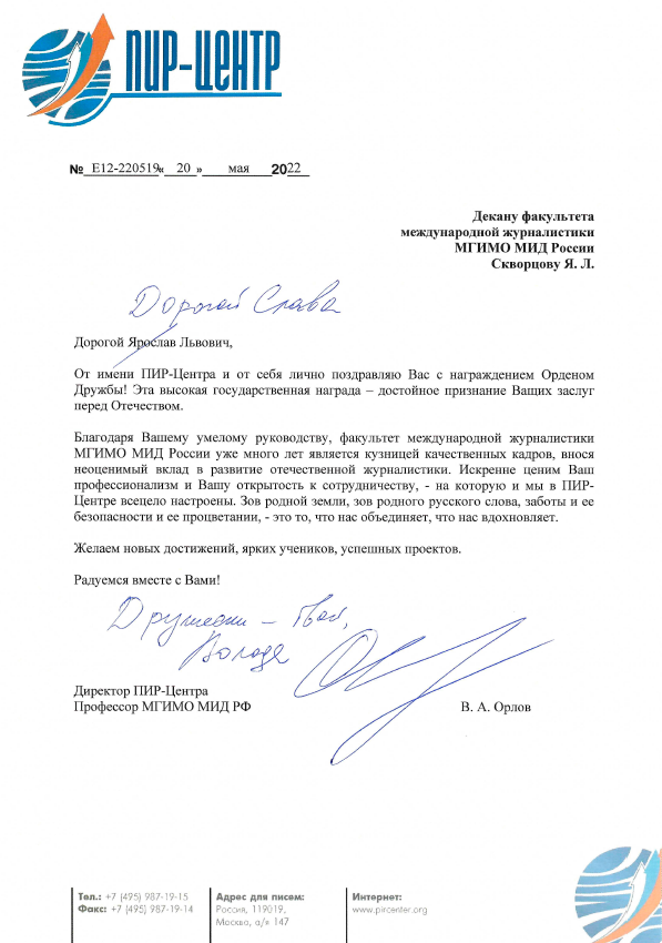 ГлавнаяПИР-Пресс сообщаетПИР-Центр поздравляет декана факультета международной журналистики МГИМО МИД России Ярослава Львовича Скворцова с награждением Орденом Дружбы!