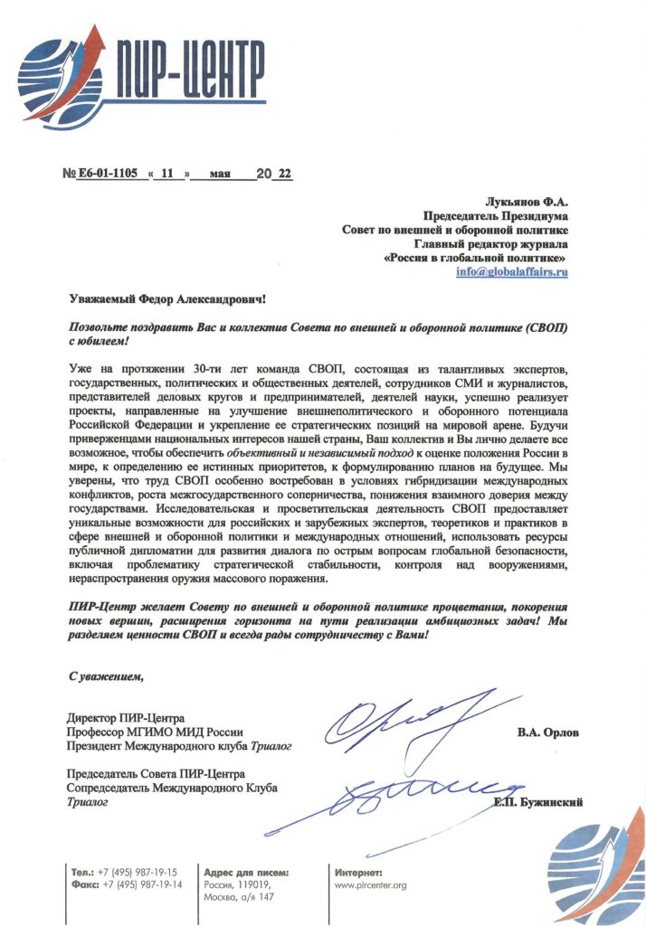 ПИР-Центр поздравляет Совет по внешней и оборонной политике (СВОП) с юбилеем!