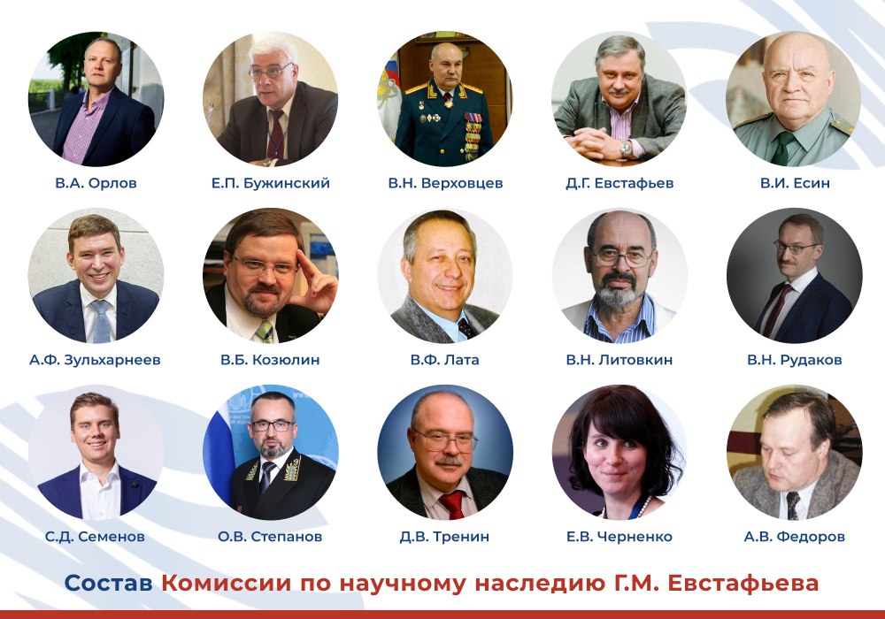 Все отобранные работы были рассмотрены и оценены членами Комиссии по научному наследию генерал-лейтенанта Г.М. Евстафьева. Председатель Комиссии — директор и основатель ПИР-Центра Владимир Орлов. В состав Комиссии входят генерал-лейтенант (в отставке) Евгений Бужинский, руководитель Центра политико-военных исследований факультета мировой политики МГУ имени М.В. Ломоносова, председатель Совета ПИР-Центра; генерал-полковник (в отставке) Владимир Верховцев, 7-й руководитель 12-го Главного управления Министерства обороны РФ (2005-2011), генеральный директор АРМЗ Росатом; Дмитрий Евстафьев, профессор факультета креативных индустрий Института медиа Высшей школы экономики, член Редакционной коллегии журнала Индекс Безопасности; генерал-полковник (в отставке) Виктор Есин, ведущий научный сотрудник Института США и Канады РАН, член Экспертного совета ПИР-Центра; Альберт Зульхарнеев, глава представительства Россотрудничества – Русского дома в Бишкеке, член Экспертного совета ПИР-Центра; Вадим Козюлин, заведующий Центром глобальных исследований и международных отношений ИАМП Дипломатической академии МИД России, член Совета ПИР-Центра; генерал-лейтенант (в отставке) Василий Лата, профессор кафедры Ракетных войск и артиллерии Военной академии Генерального штаба ВС РФ, консультант ПИР-Центра; Виктор Литовкин, военный обозреватель ТАСС; Владимир Рудаков, главный редактор журнала Историк, член Экспертного совета ПИР-Центра; Сергей Семенов, научный сотрудник ПИР-Центра; Олег Степанов, Чрезвычайный и Полномочный Посол России в Канаде, член Экспертного совета ПИР-Центра; Дмитрий Тренин, профессор-исследователь факультета мировой экономики и мировой политики НИУ ВШЭ, директор по науке Института военной экономики и стратегии НИУ ВШЭ, ведущий научный сотрудник Сектора по нераспространению и ограничению вооружений Центра международной безопасности ИМЭМО имени Е.М. Примакова РАН, бывший директор Московского Центра Карнеги, член Совета ПИР-Центра; Елена Черненко, специальный корреспондент ИД Коммерсант, член Совета ПИР-Центра; Александр Федоров, доцент кафедры защиты информации факультета Информатика, искусственный интеллект и системы управления МГТУ имени Н.Э. Баумана, член Экспертного совета ПИР-Центра.