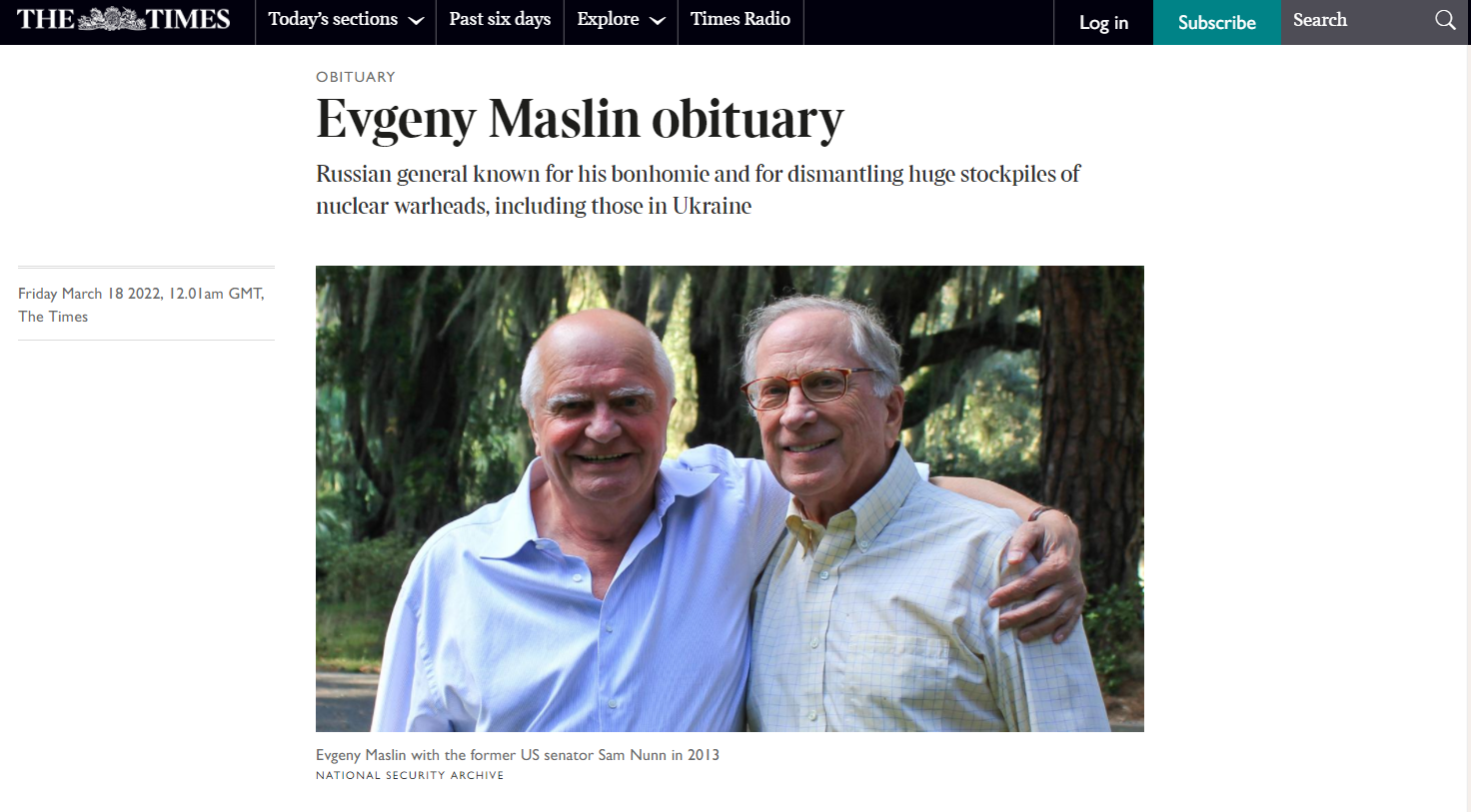 Личность Евгения Петровича Маслина была столь выдающаяся и значимая, что даже в период беспрецедентных санкции и охлаждении отношении между Россией и Западом, ведущие американские и европейские СМИ публикуют некрологи о российском генерале. В этот раз от британской газеты The Times вышла статья, посвященная члену Совета ПИР-Центра, генерал-полковнику Евгению Маслину: