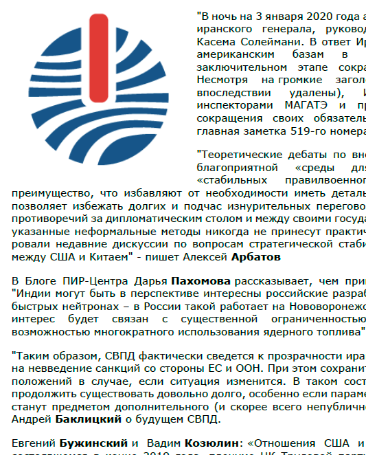 Ситуация вокруг иранской ядерной программы рассматривается ПИР-Центром с разных углов. Внимание уделяется и непосредственно дискуссиям по ядерной проблематике внутри Ирана. В частности, ПИР-Центром издается дайджест иранской прессы по тематике, связанной с иранской ядерной программой. Мониторинг такой прессы позволяет лучше понимать движущие силы политики Тегерана в этой сфере.