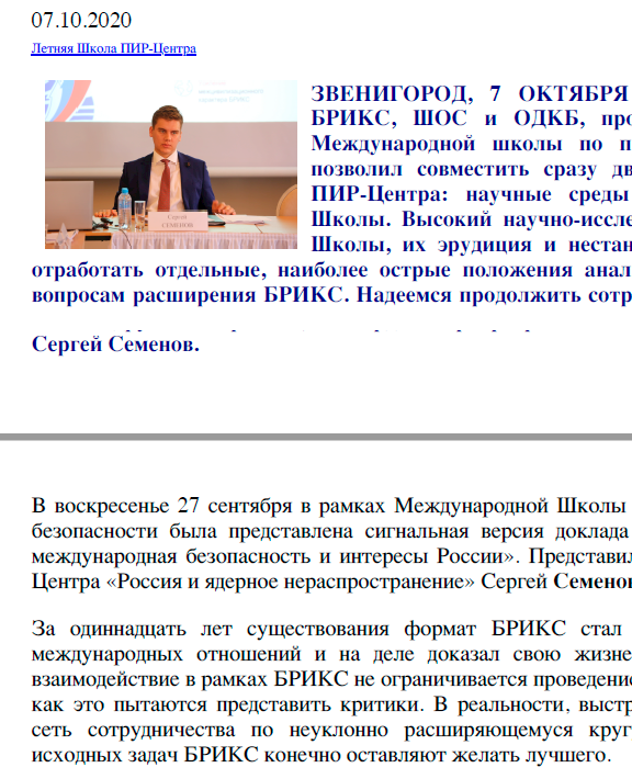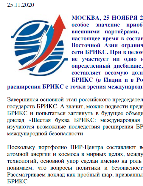 ПИР-Центр анализирует участие России в формате БРИКС и ее сотрудничество с партнерами в сфере высоких технологий (атомная энергетика, информационные технологии и использование космического пространства).